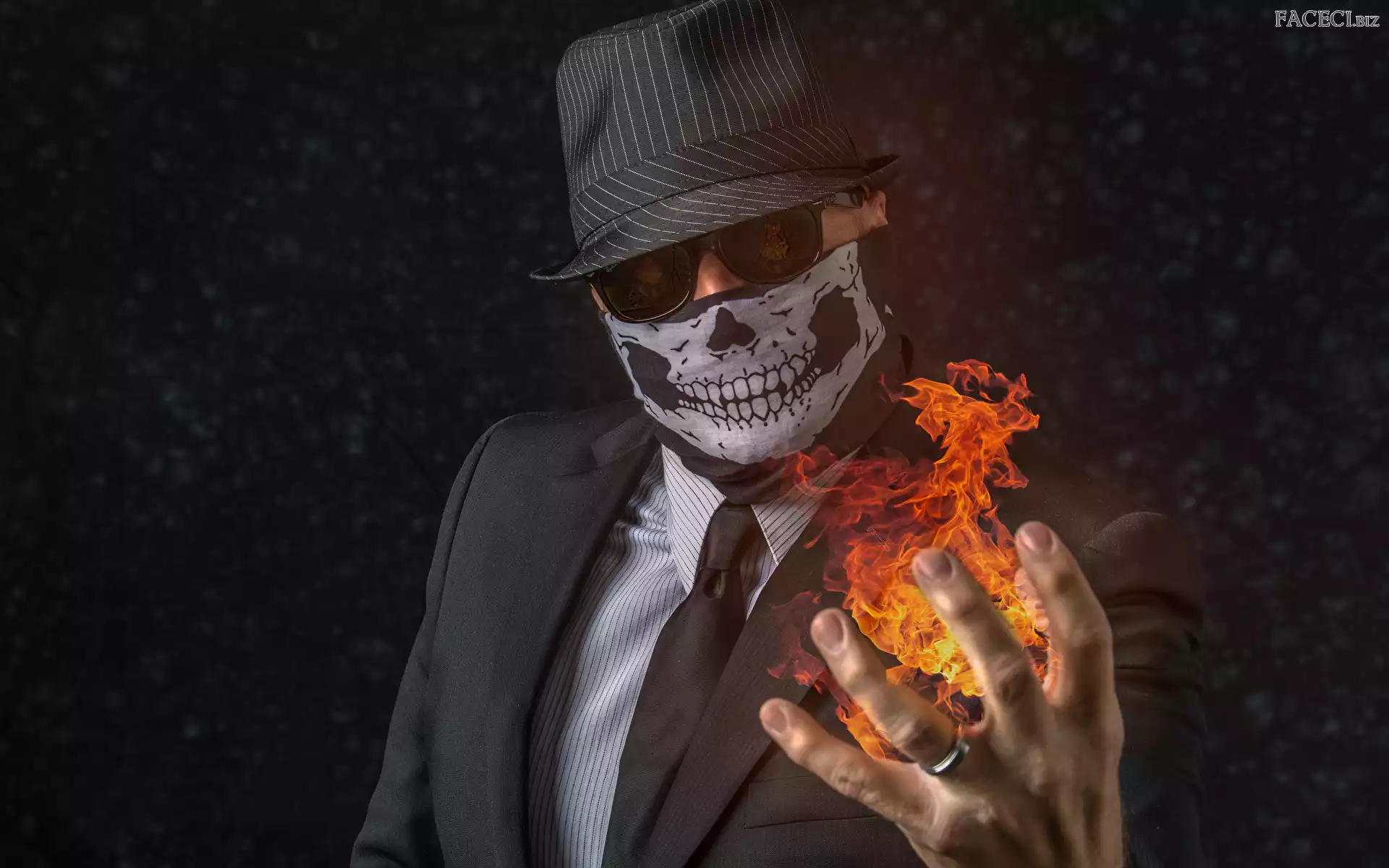Ręka, Mężczyzna, Kapelusz, Maska, Czarne tło, Okulary, Ogień - faceci.biz